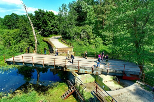 Most forteczny z 1936 roku na kanale Obry stanowiący część MRU. Konstrukcja oraz napęd linowy umożliwiają na obrót wokół osi i ustawienie równoległe do rzeki. Stary Dworek